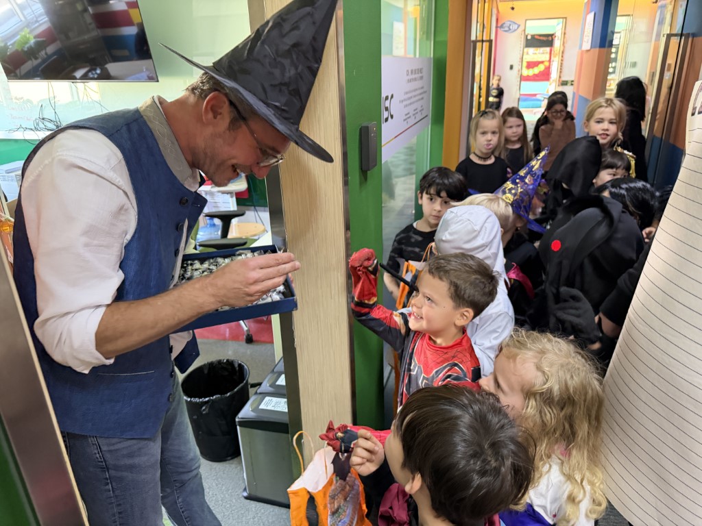 Ein besonderes Erlebnis war das „Trick or Treat“-Spiel. Mit selbstgebastelten Tüten zogen die Kinder durch die Schule und besuchten verschiedene Stationen – darunter auch das Büro unseres neuen Schulleiters, Herrn Moser, der sich über den Besuch freute und die Kinder mit Süßigkeiten überraschte. Die Runde durch die Schule war spannend und bot viele kleine Begegnungen und Überraschungen.