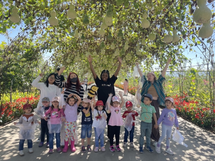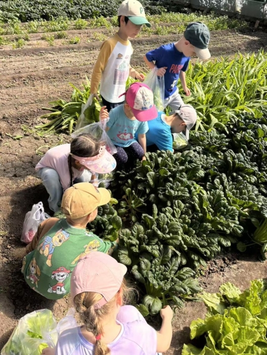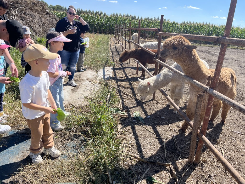 Gestärkt vom Mittagessen machten wir uns auf zur letzten Station: den Farmtieren! Der Spaziergang dorthin war länger als gedacht. Wir kamen an einem Teich mit Gold- und Koifischen vorbei, sahen Weinreben und ein Labyrinth aus meterhohem Mais.