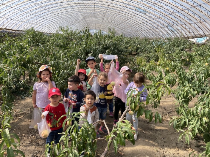 Anschließend teilten wir uns in unsere Gruppen auf und fuhren zur ersten Station: riesige Gewächshäuser! Schon beim Aussteigen versuchten wir, einen Blick hineinzuwerfen. Jede Gruppe bekam ihr eigenes Gewächshaus, und wir erfuhren, dass wir Pfirsiche pflücken würden. Überall im Gewächshaus standen kleine Pfirsichbäume, und wir machten uns fleißig auf die Suche nach schönen gelb-pinken Früchten.