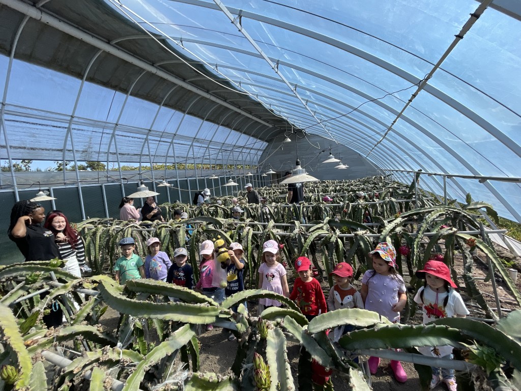 Zuerst waren wir unsicher, was wir nun pflücken sollten – die Pflanzen sahen aus wie Kakteen, und uns fiel keine Frucht ein, die daran wachsen könnte. Doch dann entdeckten wir leuchtend pinke Früchte zwischen den grünen Stacheln: Drachenfrüchte! Jetzt war klar, was zu tun war.