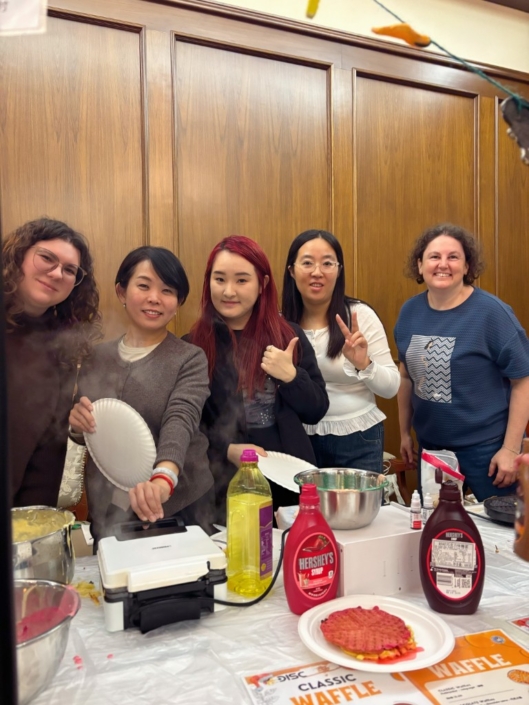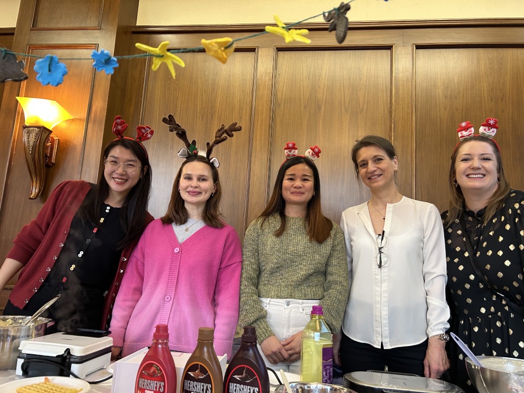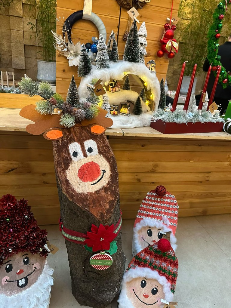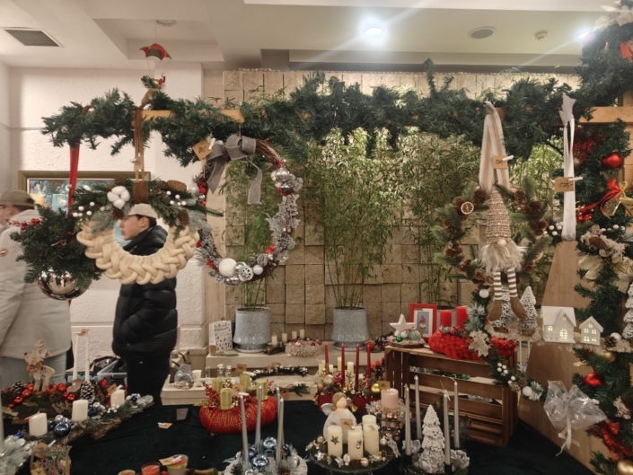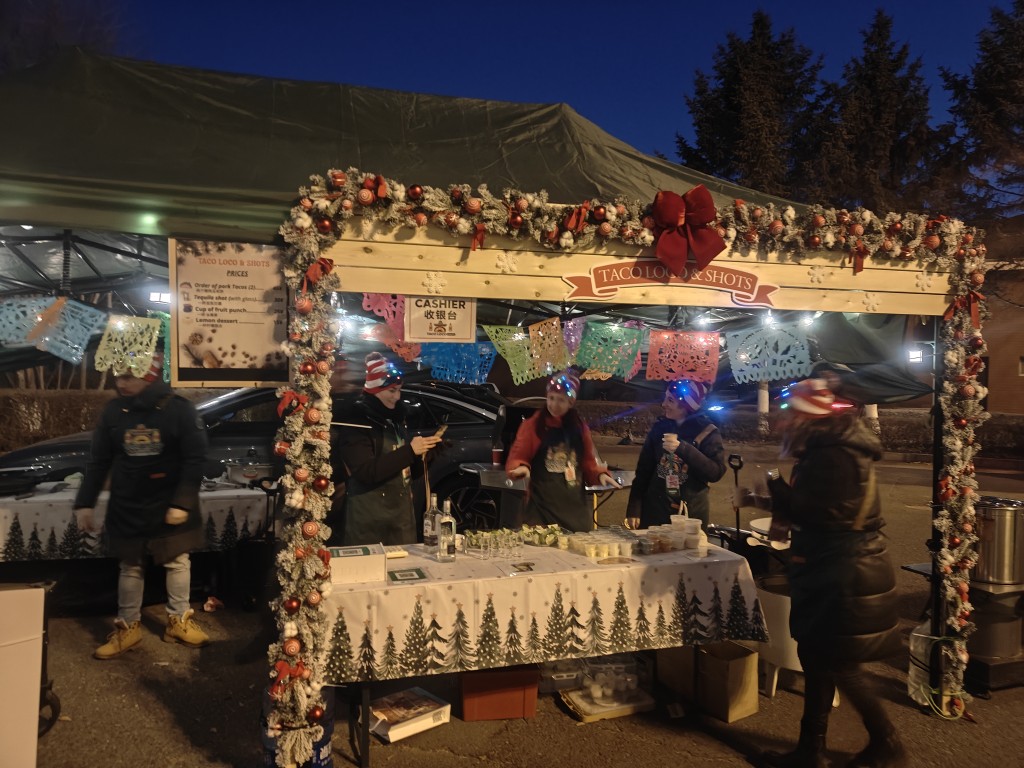 Neben dem musikalischen Programm sorgten zahlreiche Stände mit Weihnachtsdekoration und Köstlichkeiten aus aller Welt für reges Treiben. Auch am Stand des deutschen Kindergartens hatten Eltern gemeinsam Teig vorbereitet, und es wurden Waffeln verkauft. Die frisch gebackenen Waffeln wurden mit Puderzucker, oder Schokolade angeboten und waren schnell ausverkauft. Der Erlös des Verkaufs kommt einem guten Zweck zugute.